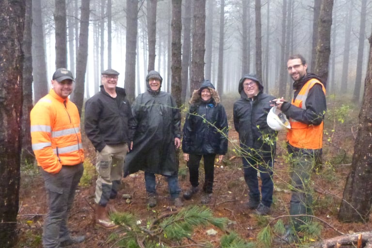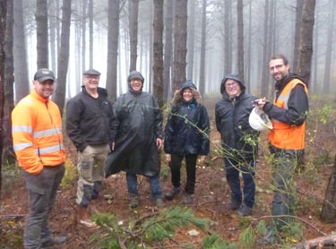 Première coupe d’éclaircie sélective dans une plantation de pins réalisée mécaniquement par l’entreprise Triboulet sous la maîtrise d’œuvre du gestionnaire Alcina. Sous une pluie battante, les gérants ont quand même pu identifier le matériel utilisé, échanger avec le gestionnaire sur la sylviculture et apprécier la qualité du travail. Voici un groupement forestier qui arrive à mettre en œuvre son PSG mais qui est encore sous tracas administratif...